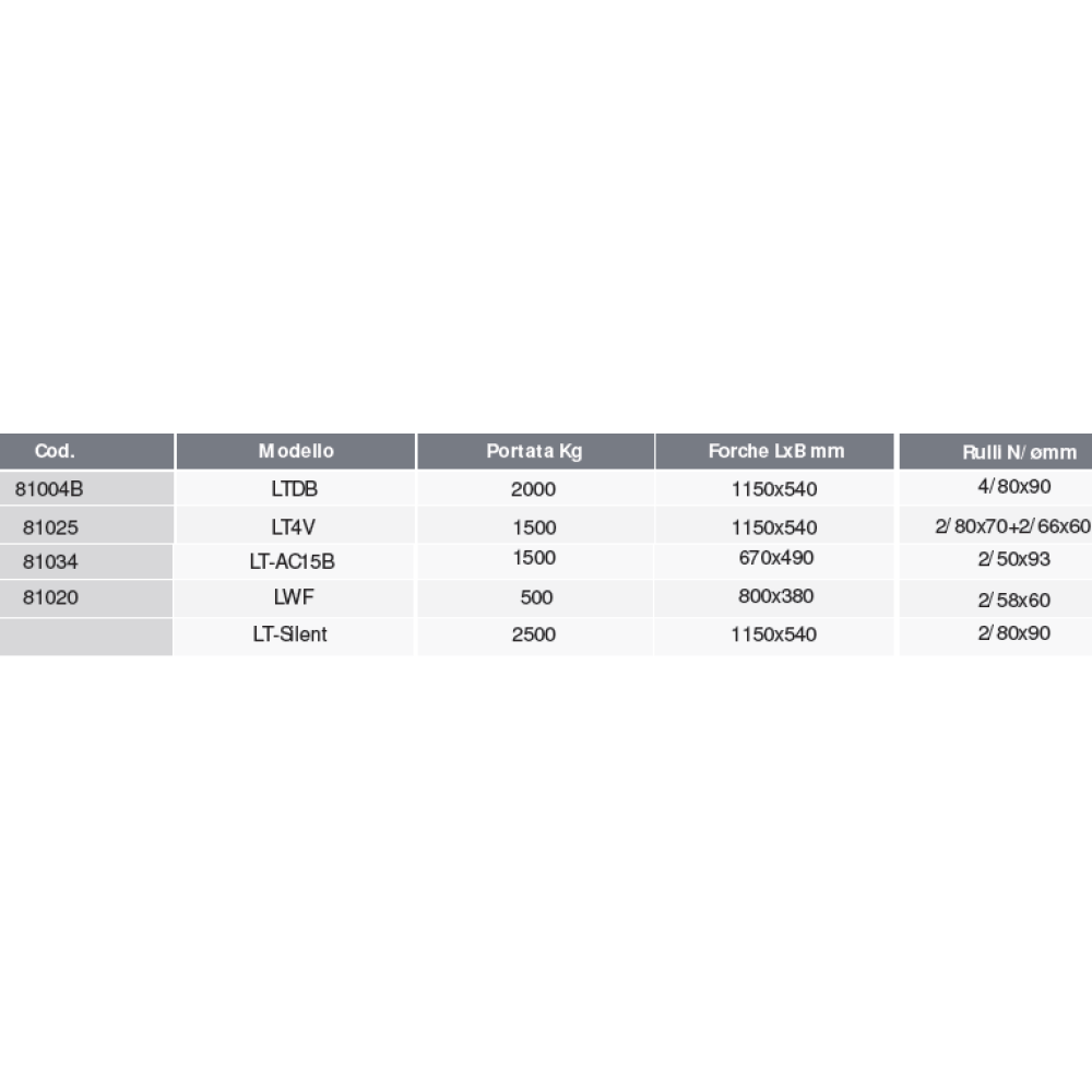 LT-Silent: transpallet con ruote in gomma elastica blu e rulli in poly morbido versione anti-rumore