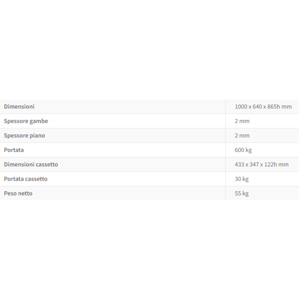 BANCO DA LAVORO MARCA FERVI ART. B015/10 CON PIANO IN LAMIERA, LUNGHEZZA 1000X640X865H mm, 1 CASSETTO CON CHIAVE, SPESSORE GAMBE 2mm, SPESSORE PIANO 2mm.