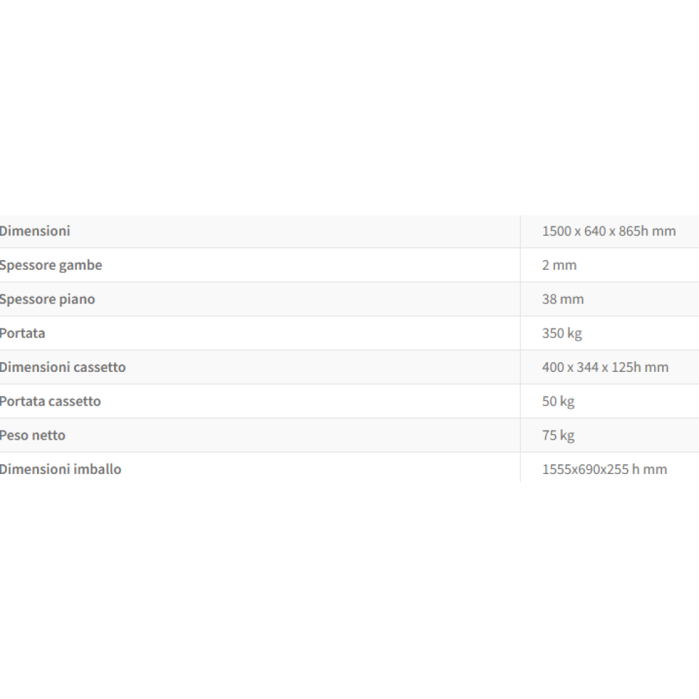 BANCO DA LAVORO MARCA FERVI ART. B22/15 CON PIANO IN LEGNO PRESSATO, LUNGHEZZA 1500X640X865H mm, 2 CASSETTI CON CHIAVE, SPESSORE GAMBE 2mm, SPESSORE PIANO 38mm, PORTATA 350 KG.