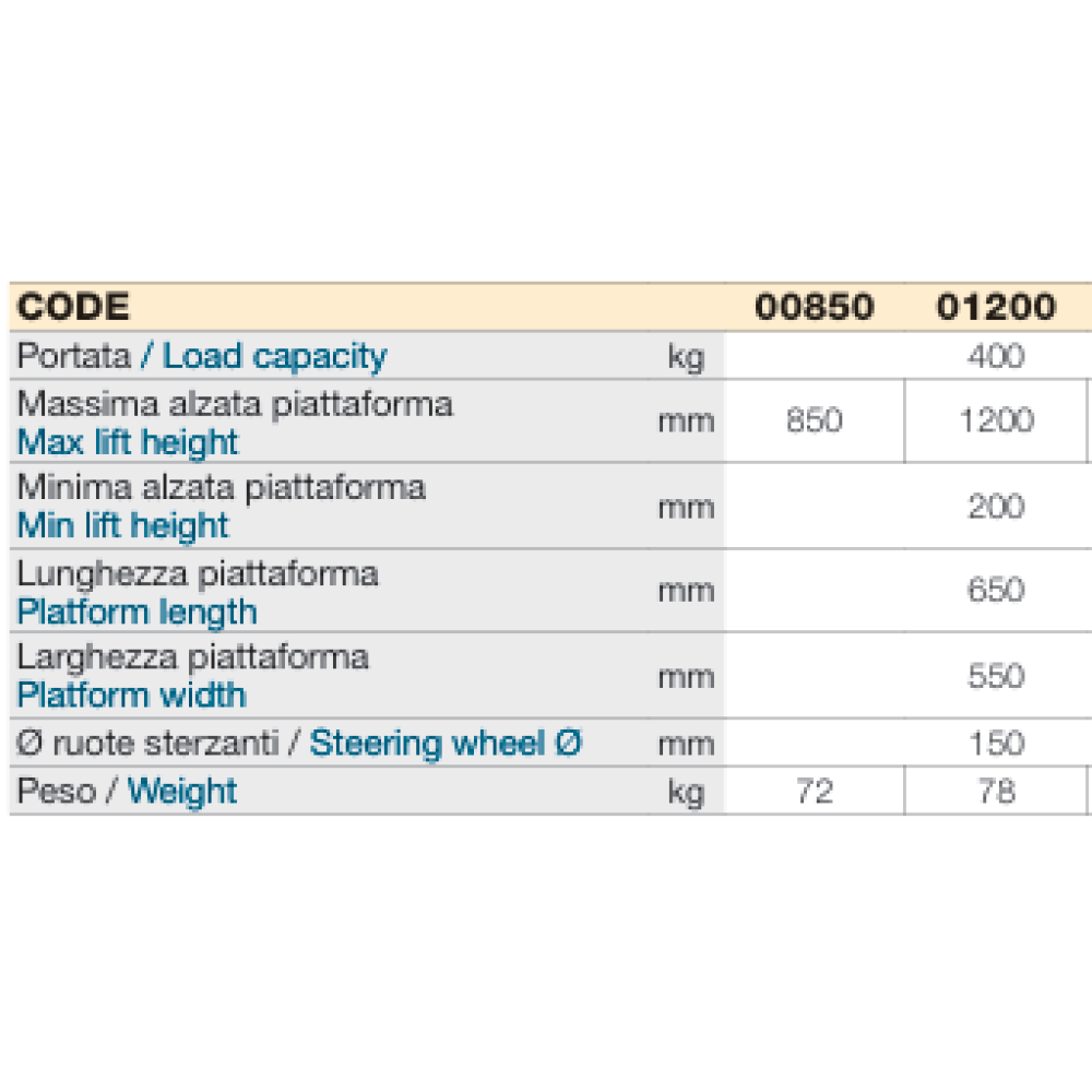 Sollevatore idraulico con valvola di sicurezza. Consente il sollevamento di un carico in condizioni di scarsa manovrabilità. Il pedale pieghevole rende agevole ed uniforme il movimento di sollevamento del carico. Movimentazione di spinta manuale. Due ruote fisse e due ruote piroettanti permettono uno spostamento stabile e sicuro.